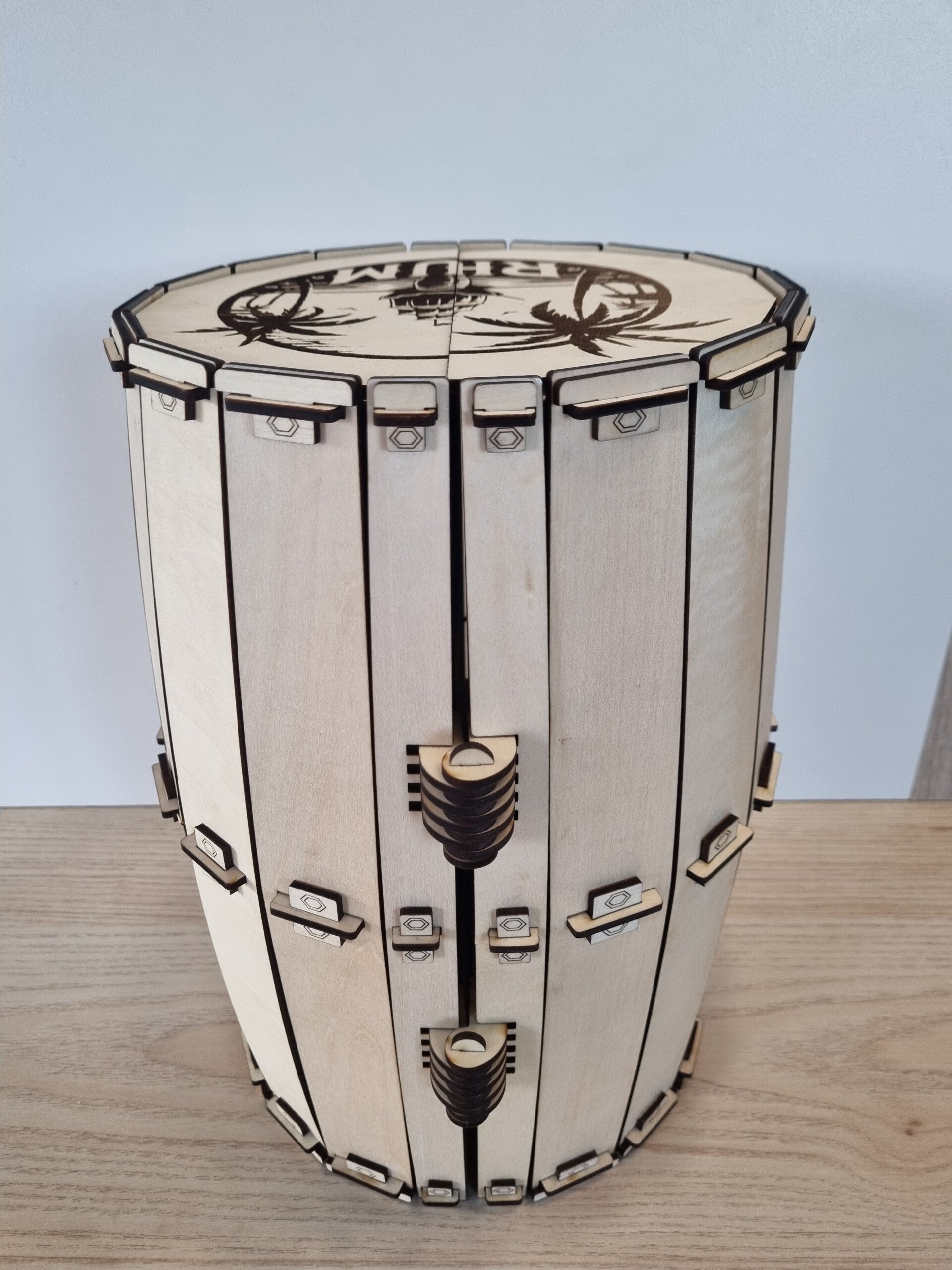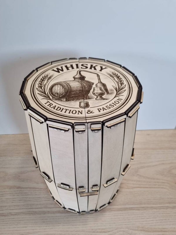 Surprenez vos proches (ou vous-même !) avec ce coffret artisanal en bois, découpé et gravé au laser, au design unique en forme de tonneau.