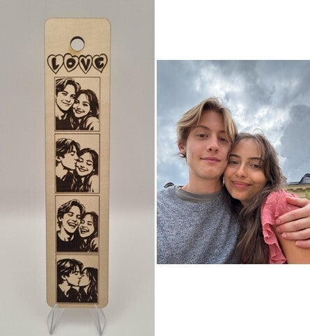 Immortalisez vos plus beaux souvenirs avec ce marque-page photomaton personnalisé en bois gravé. Grâce à la gravure laser, vos photos sont transformées en une illustration élégante et durable directement gravée sur le bois.