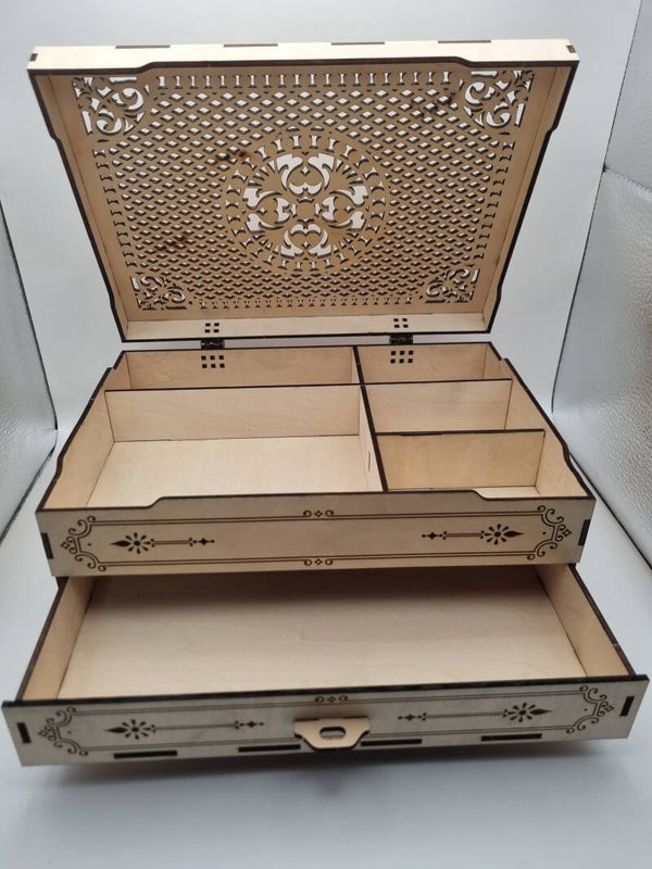 Range et protège tes bijoux avec élégance grâce à cette magnifique boîte à bijoux en bois. Son couvercle ajouré au motif raffiné apporte une touche décorative unique, tout en laissant respirer le contenu.